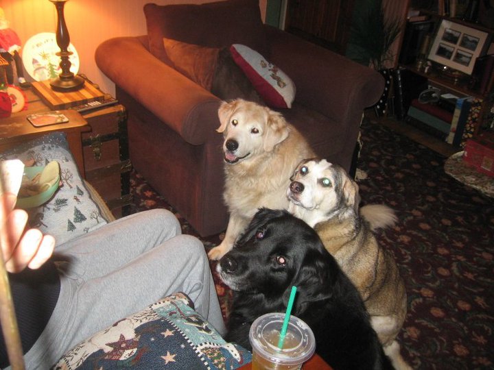 She joined our family when I went to the animal shelter in search of a companion for our Golden Retriever, Jake – a perpetual puppy until his last breath in December. Her original name was “Whimsy,” and she’d obviously been obtained on a whim by her former owners because their excuse for leaving her at the shelter was, “Didn’t have enough time for her.” Poor thing was shaking in her crate, and it was three months later before she barked. Surprised the heck out of all of us, and we praised her like she’d thrown the winning pass in the Super Bowl. (In the photo: Jake, Mathilda and Cooper)